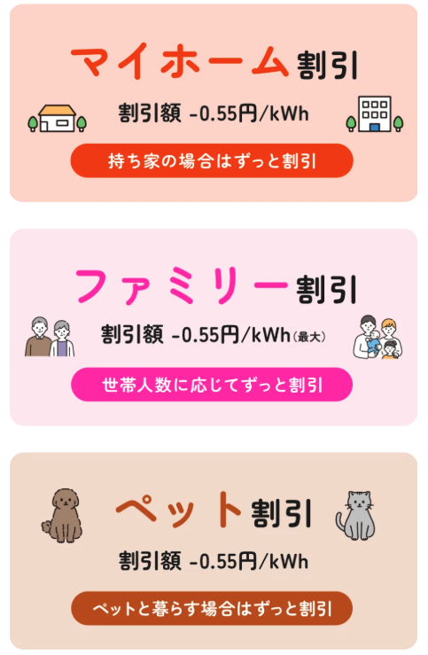 それに将来的に家族、ペットが増えたり、オール電化や太陽光の導入などをした際は割引適用となるので、長い目でみるとおすすめですよ!