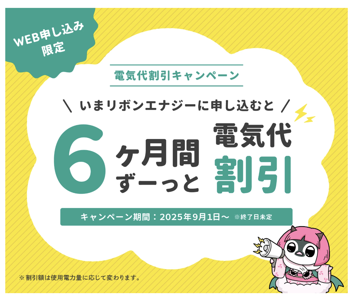 電気を使うごとに -0.55円(税込)/kWhの割引 が6か月間ずっと続きます!