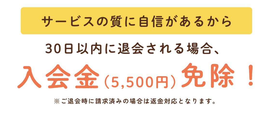 入会金5,500円が必要ですが、返金保証として、30日以内の退会時は入会金が免除となります。