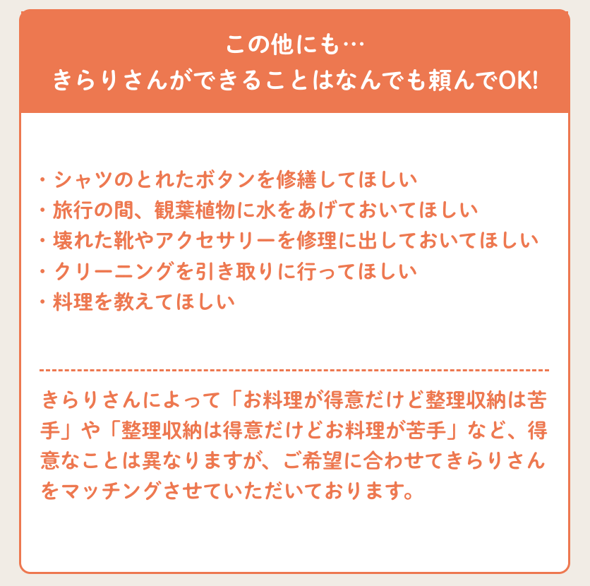 専任制の場合、同じ人がご家庭の家事事情も熟知してくれるので、「これもやっくれるんだ!」と感動レベルで満足できる可能性がグンと上がります。